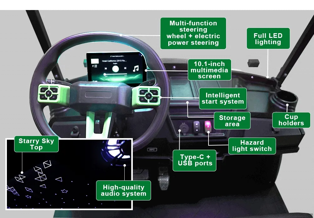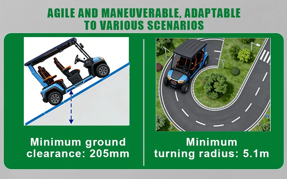 7.5KW dual AC motor, 76.8V 150AH lithium battery, 95–110km range, 25% climbing ability, excels on various terrains.